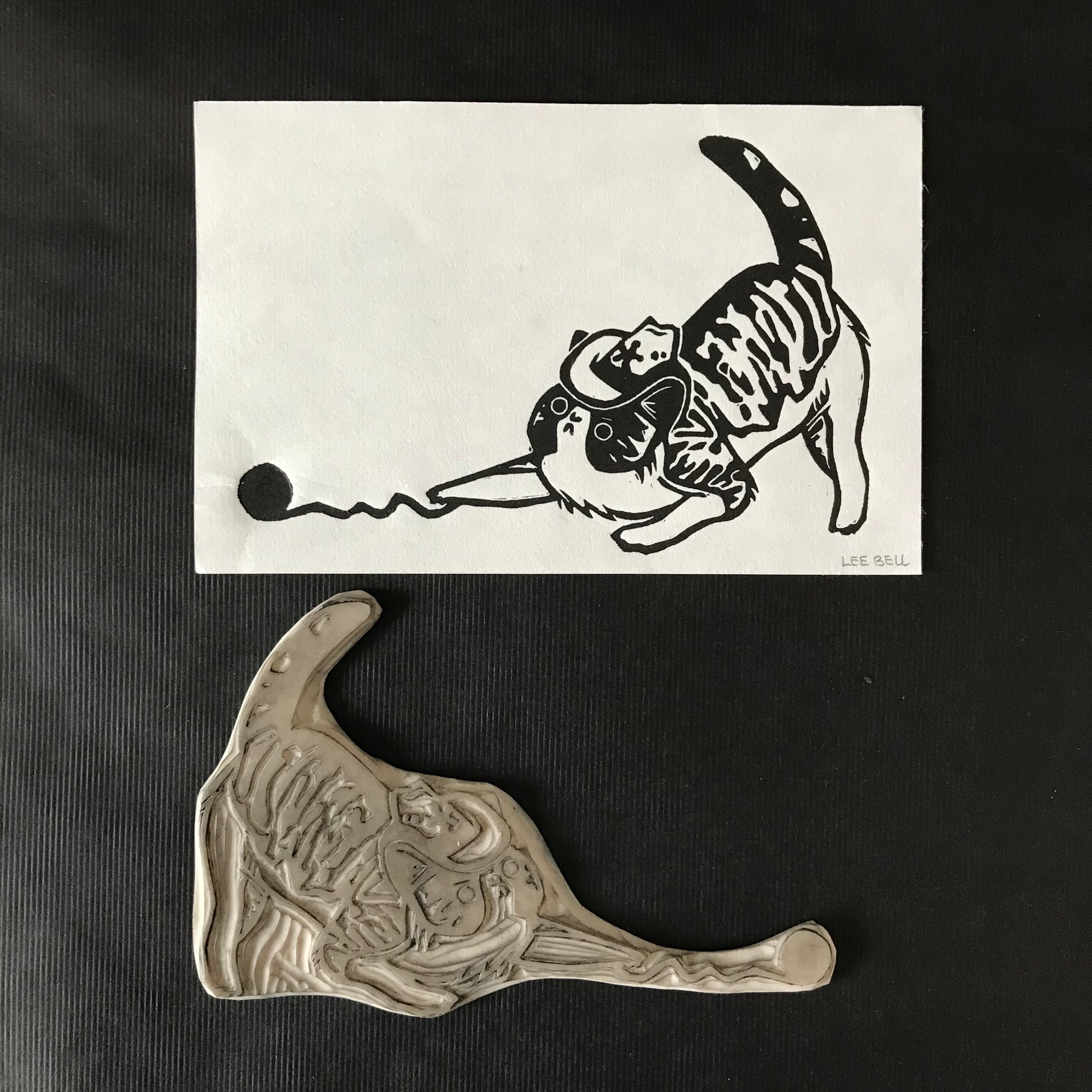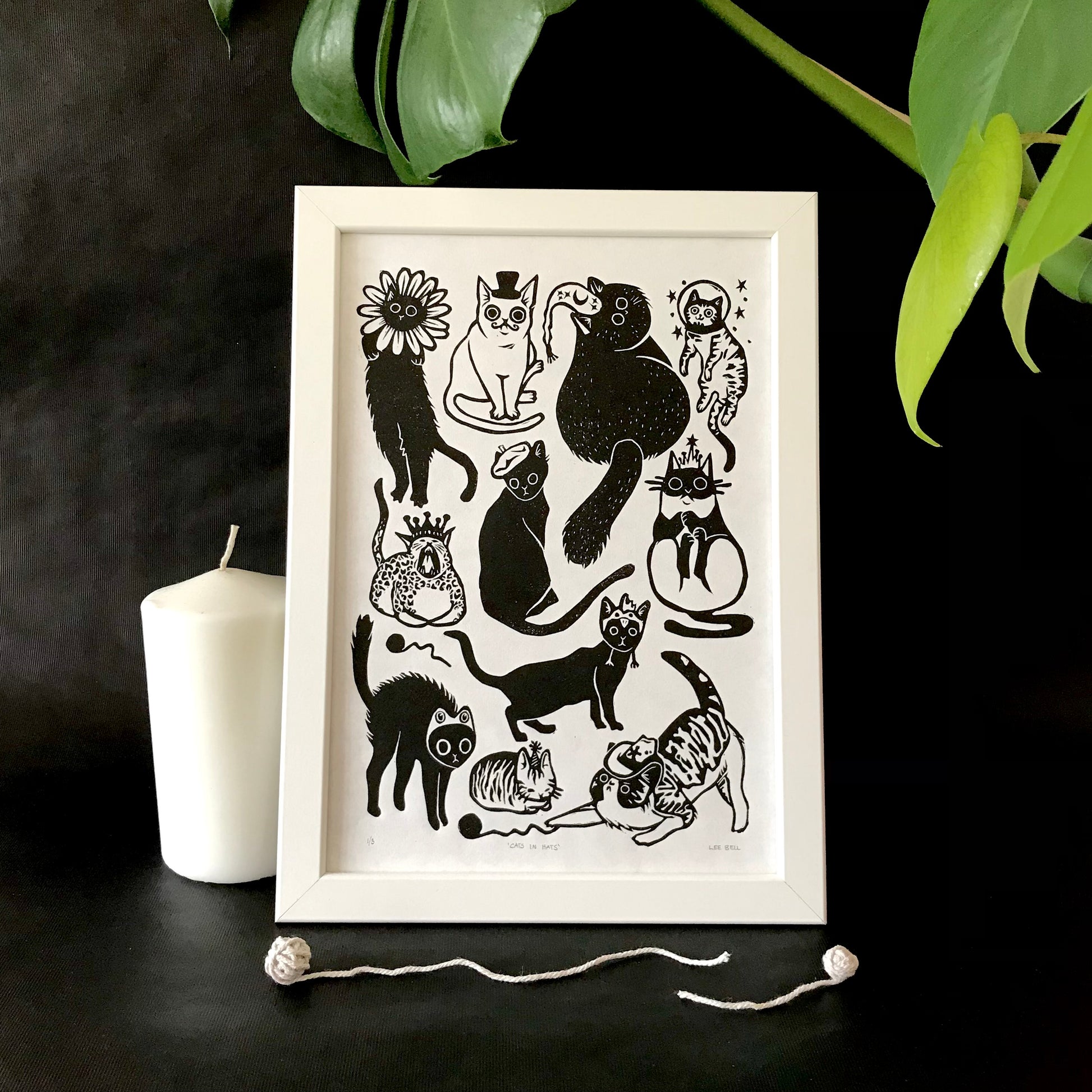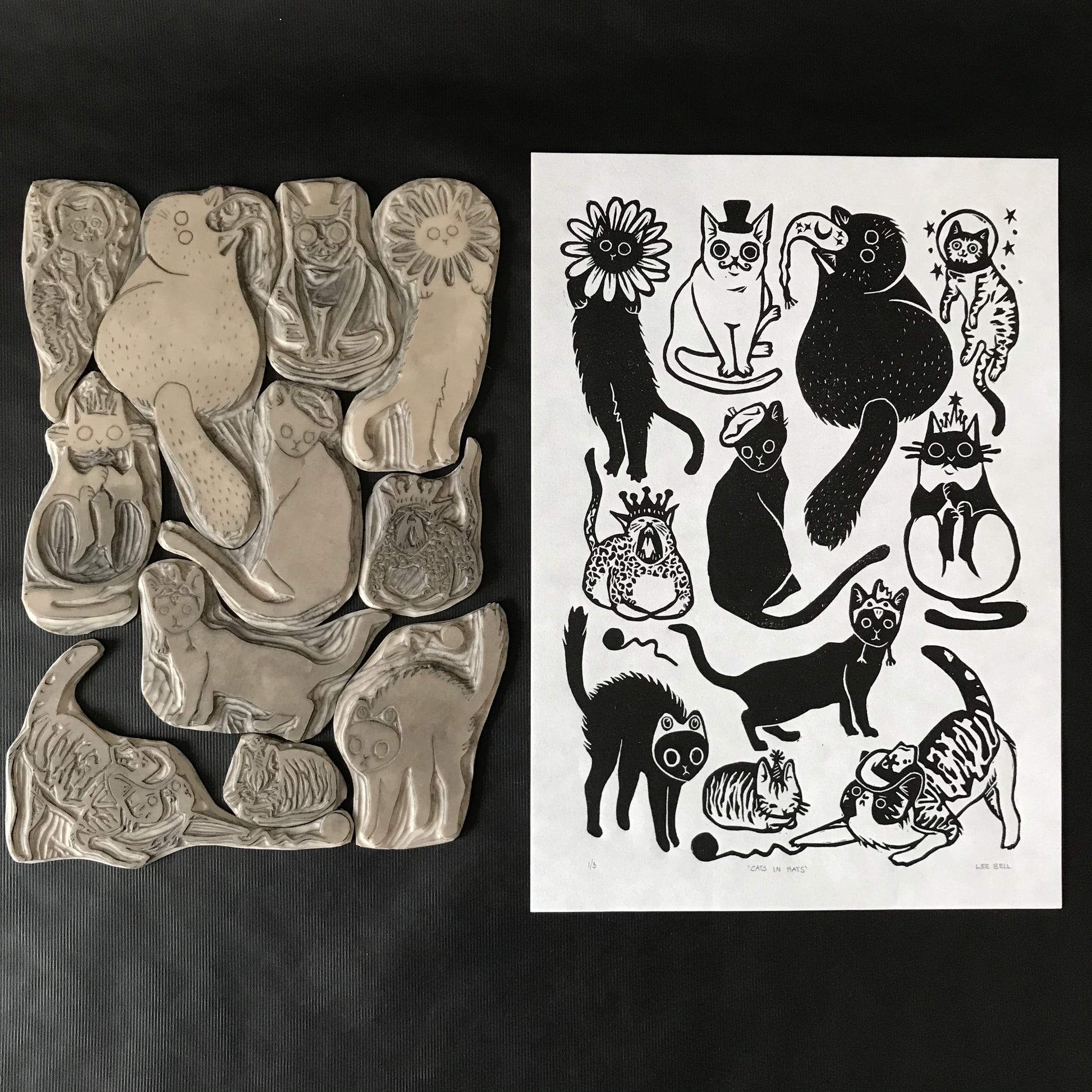 Original Handprinted ‘Cats In Hats’ Lino Art Prints