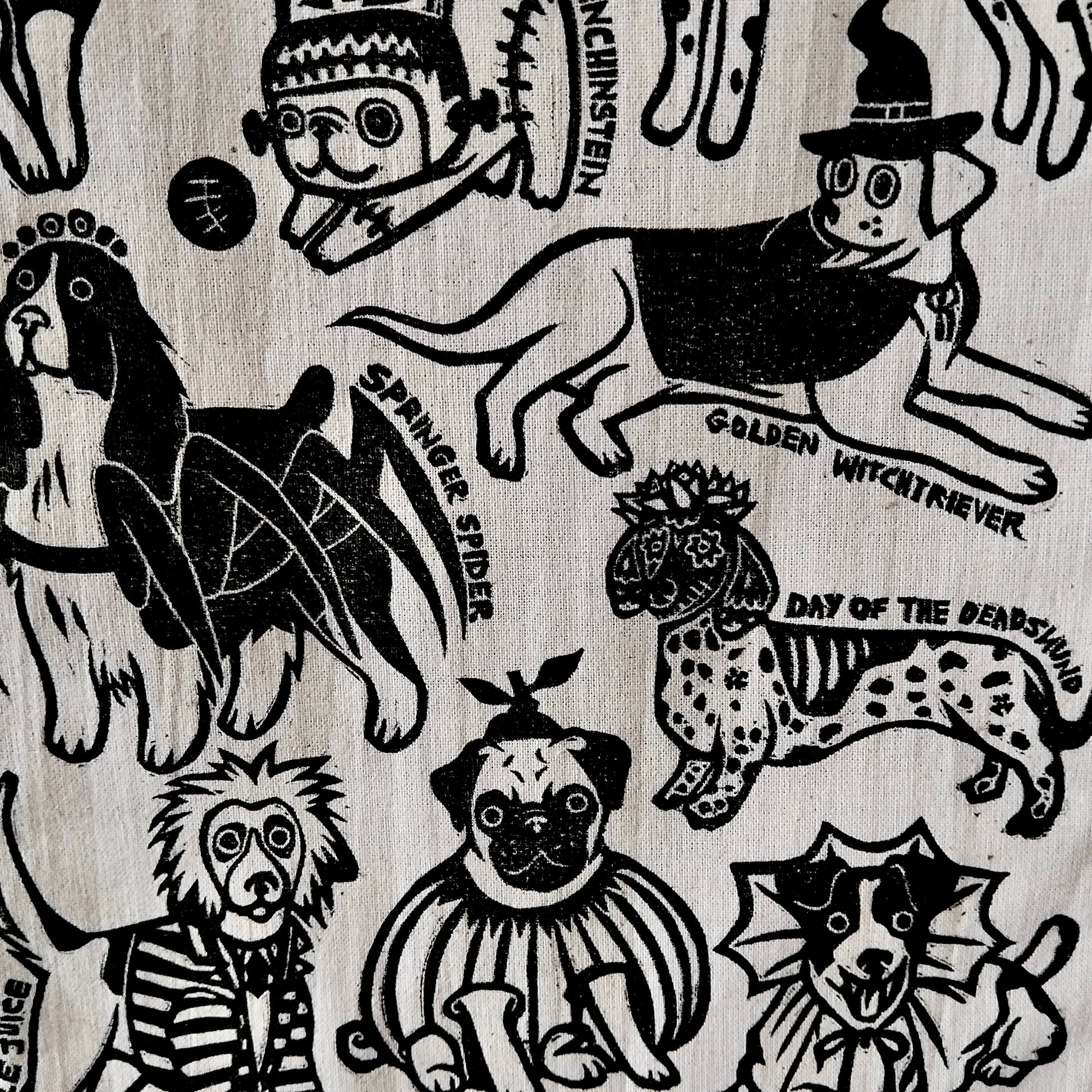 - Design: Original linocut artwork featuring playful dogs dressed in Halloween costumes