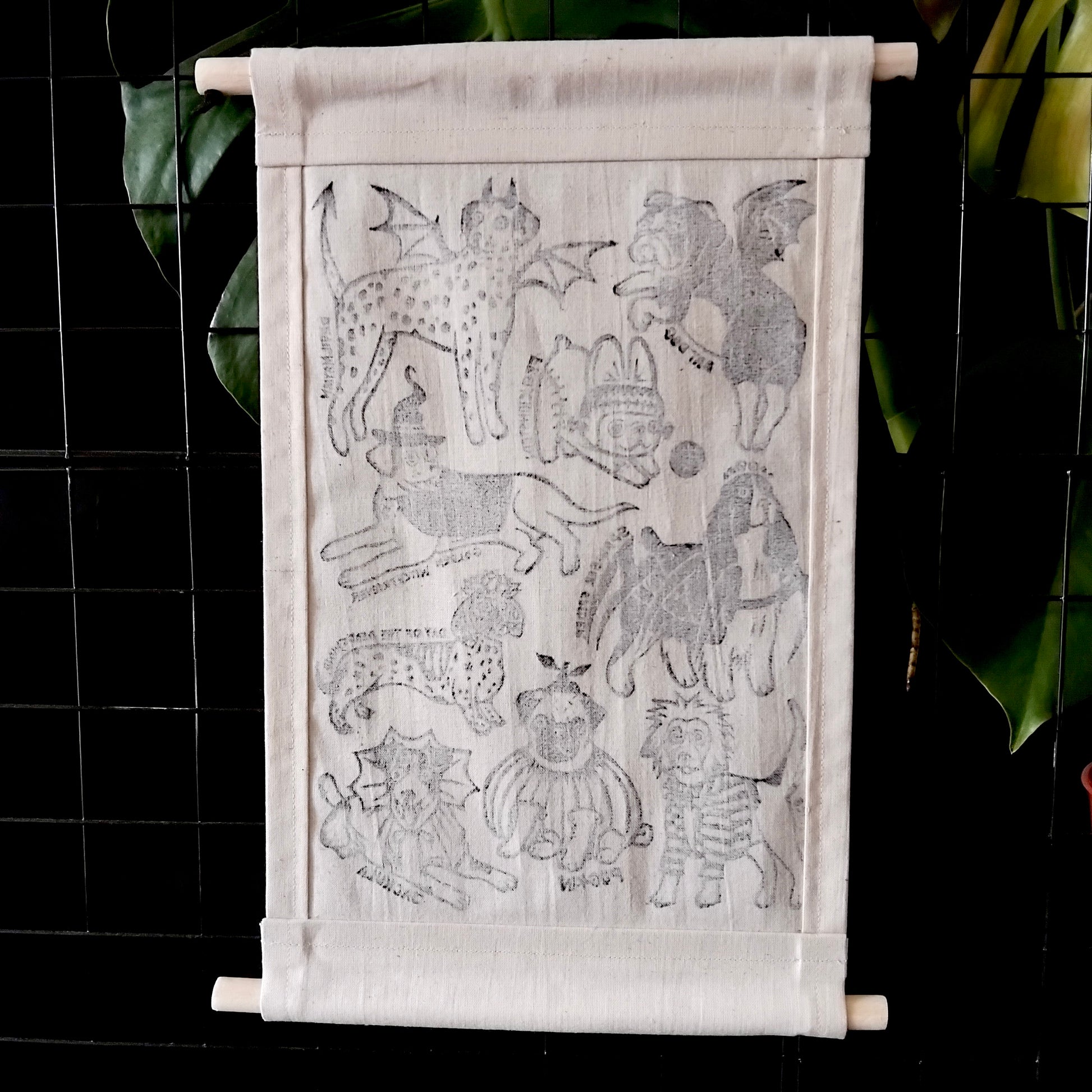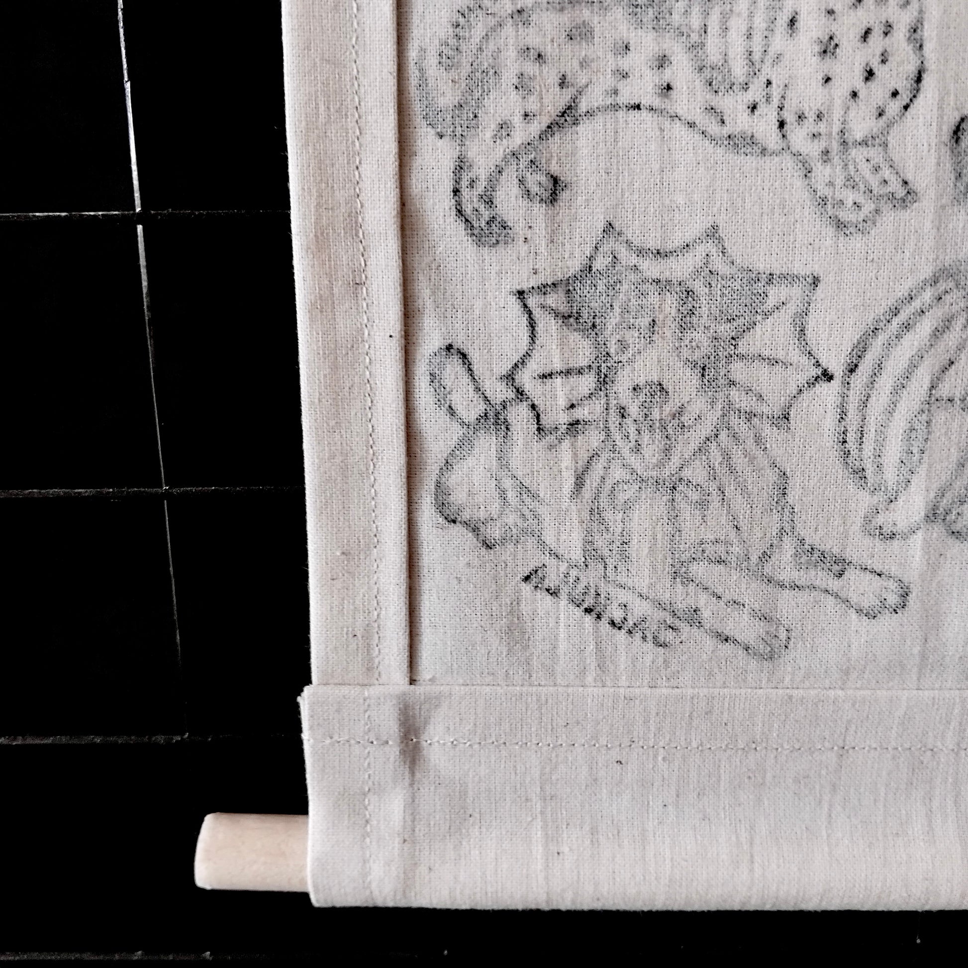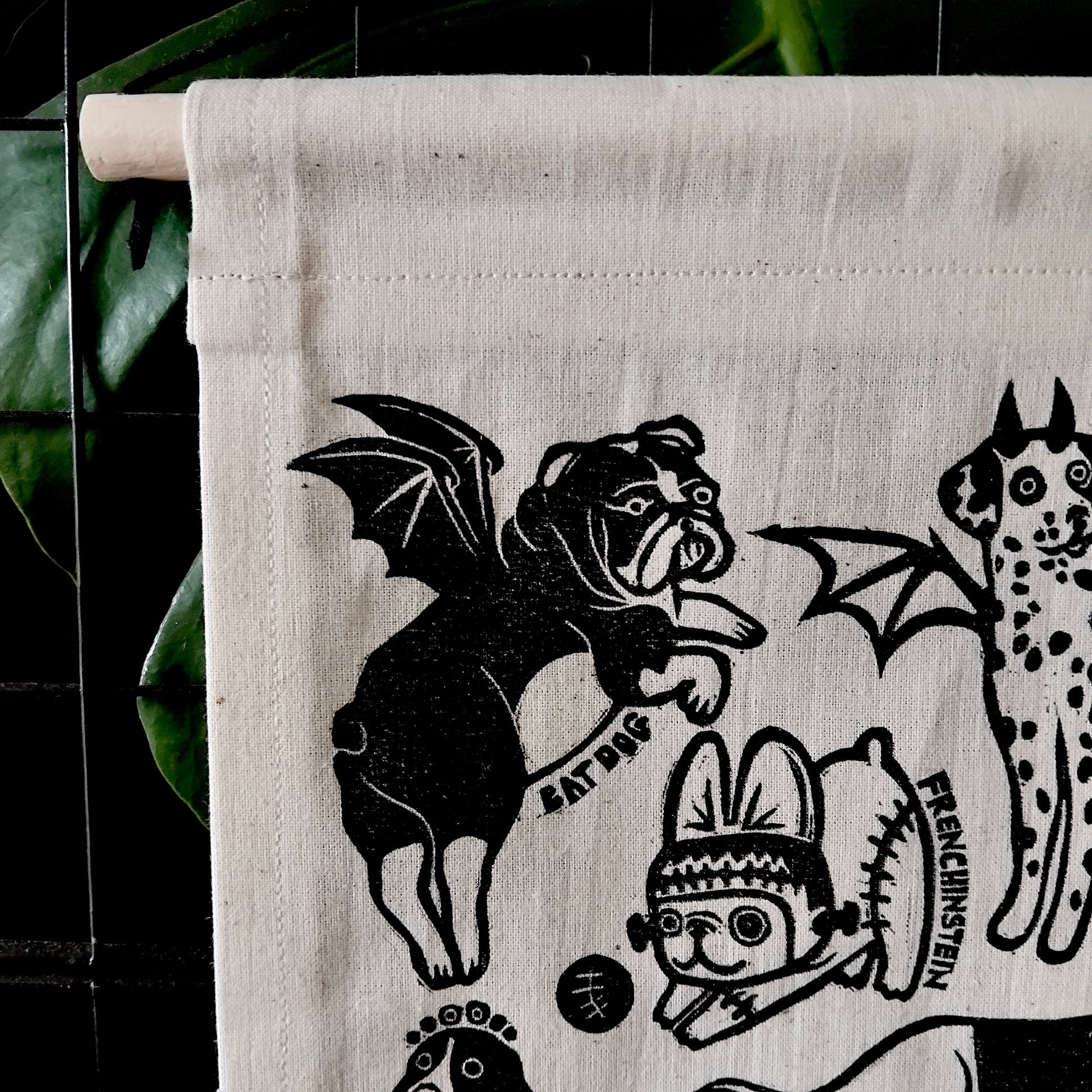 Add a touch of spooky fun to your walls with this playful fabric wall hanging banner, featuring my original Halloween Doggy Dress Up linocut design. Each banner is lovingly hand-printed and hand-sewn by me, ensuring a unique piece of art for your home.