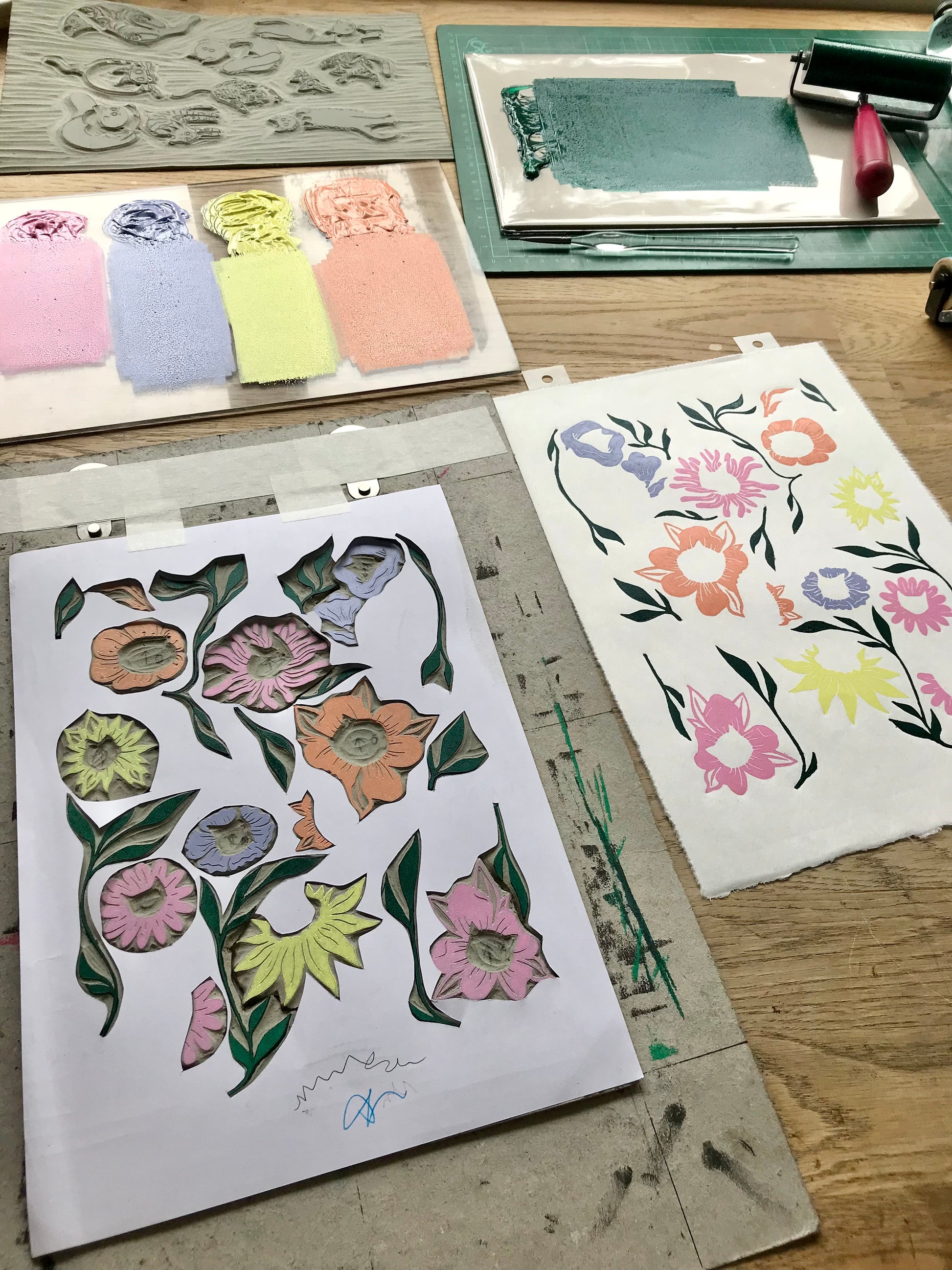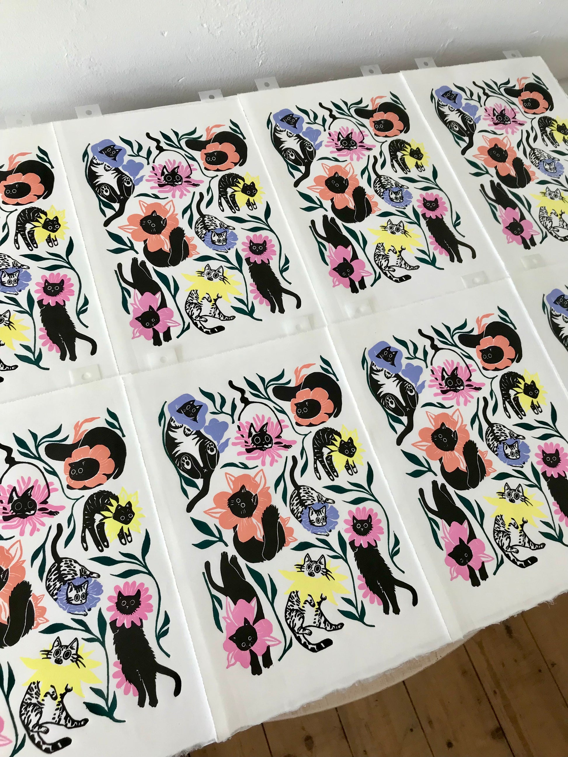 Hand-Printed ‘Flower Hat Cats’ A4 Lino Print